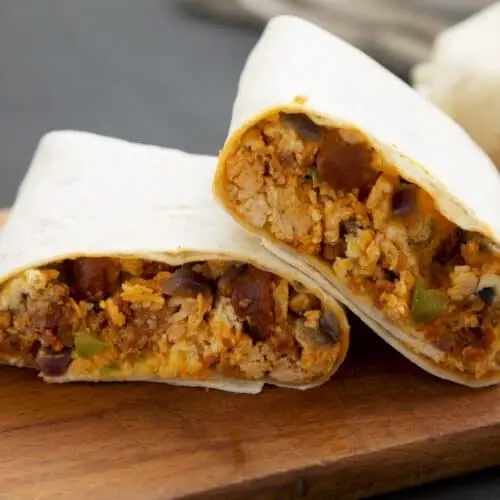 - Roll up the burrito and serve hot. If you like your burritos cheesy, top them with extra cheese and place them in the oven just until the cheese melts.