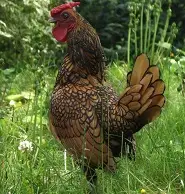 showchickensSeabright – A true bantam, or miniature bird with no large version of the breed, is a beautiful ornamental chicken. Seabright is strictly an ornamental chicken, and boasts a specialist club for enthusiasts. The plumage on all Seabrights has lacy black edges on a silver white or dark gold base. Their legs are unfeathered with slate-blue skin while their combs, earlobes, and wattles are bright red. Seabrights are tame but males may become protective around hens, possibly turning on their owners however, this can happen with any rooster breed.